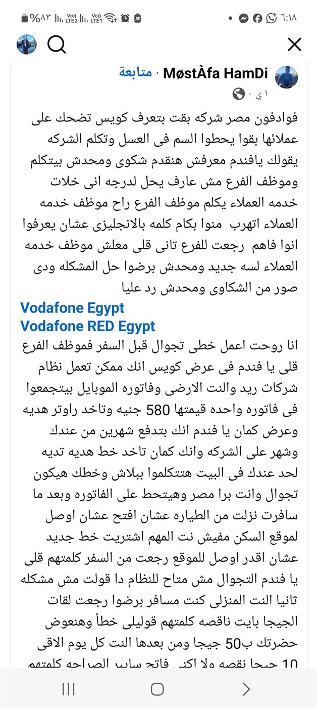 وقال أحد المتضررين من شبكة فودافون مصر، إن أحد ممثلي خدمة عملاء الشركة، قدم له عرضا وهميا، يحتوي على عدد من المزايا، ولكن الباقة لا تشمل تلك المزايا، معلقا: “روحت أعمل خطى تجوال قبل السفر فموظف الفرع قالى يا فندم في عرض كويس انك ممكن تعمل نظام شركات ريد والنت الأرضي وفاتورة الموبايل بيتجمعوا في فاتورة واحده قيمتها 580 جنيها وتاخد راوتر هدية .. وعرض كمان انك بتدفع شهرين من عندك وشهر على الشركة وإنك كمان تاخد خط هديه تديه لحد عندك في البيت هتتكلموا ببلاش وخطك هيكون تجوال وانت برا مصر وهيتحط على الفاتورة”.