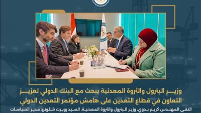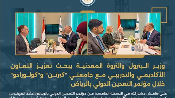 على هامش مشاركته في النسخة الخامسة من مؤتمر التعدين الدولي بالرياض، عقد المهندس كريم بدوي، وزير البترول والثروة المعدنية، لقاءين مع كل من البروفيسور جون أونيل، مدير قطاع الشراكات الحكومية والصناعية بجامعة كيرتن الأسترالية، والبروفيسور مورجان بازيليان، مدير معهد باين للسياسة العامة بجامعة كولورادو للمناجم ، بحث خلالهما التعاون مع الجامعتين الاكبر عالميا في علوم التعدين لتطوير الكوادر البشرية المصرية .