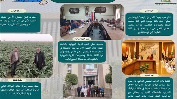 وأعلن معهد بحوث القطن بمركز البحوث الزراعية عن تشكيل لجنة دائمة موحدة تضم كافة المعاهد البحثية والقطاعات التنفيذية بالوزارة؛ لمتابعة محصول القطن على مدار العام وتذليل كافة العقبات التي تواجه الإنتاج، كما استعرض قطاع استصلاح الأراضي جهوده خلال النصف الول من يناير حيث تم إزالة 53 حالة تعدي وتطهير 13 مسقى و 16 مصرف، كذلك استعرض قطاع تنمية الثروة الحيوانية والداجنة جهوده خلال النصف الاول من يناير والمتمثلة في إصدار نحو 465 ترخيص تشغيل ما بين تجديد وأول مرة لكافة أنشطة ومشروعات الثروة الحيوانية والعلفية والداجنة ومراكز تجميع الألبان.