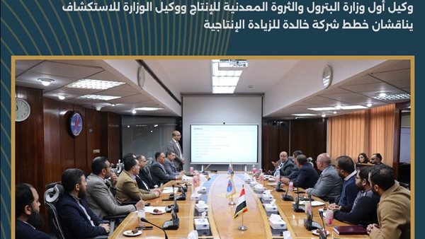 تنفيذاً لاستراتيجية وزارة البترول والثروة المعدنية لتعظيم إنتاج البترول والغاز، عقد المهندس إيهاب رجائي، وكيل أول الوزارة للإنتاج، والدكتور سمير رسلان، وكيل الوزارة للاستكشاف والاتفاقيات، اجتماعاً مع المهندس معتز عاطف، رئيس شركة خالدة للبترول، والإدارات الفنية بالشركة لمناقشة خطط زيادة الإنتاج واستعراض الرؤية المستقبلية للشركة.