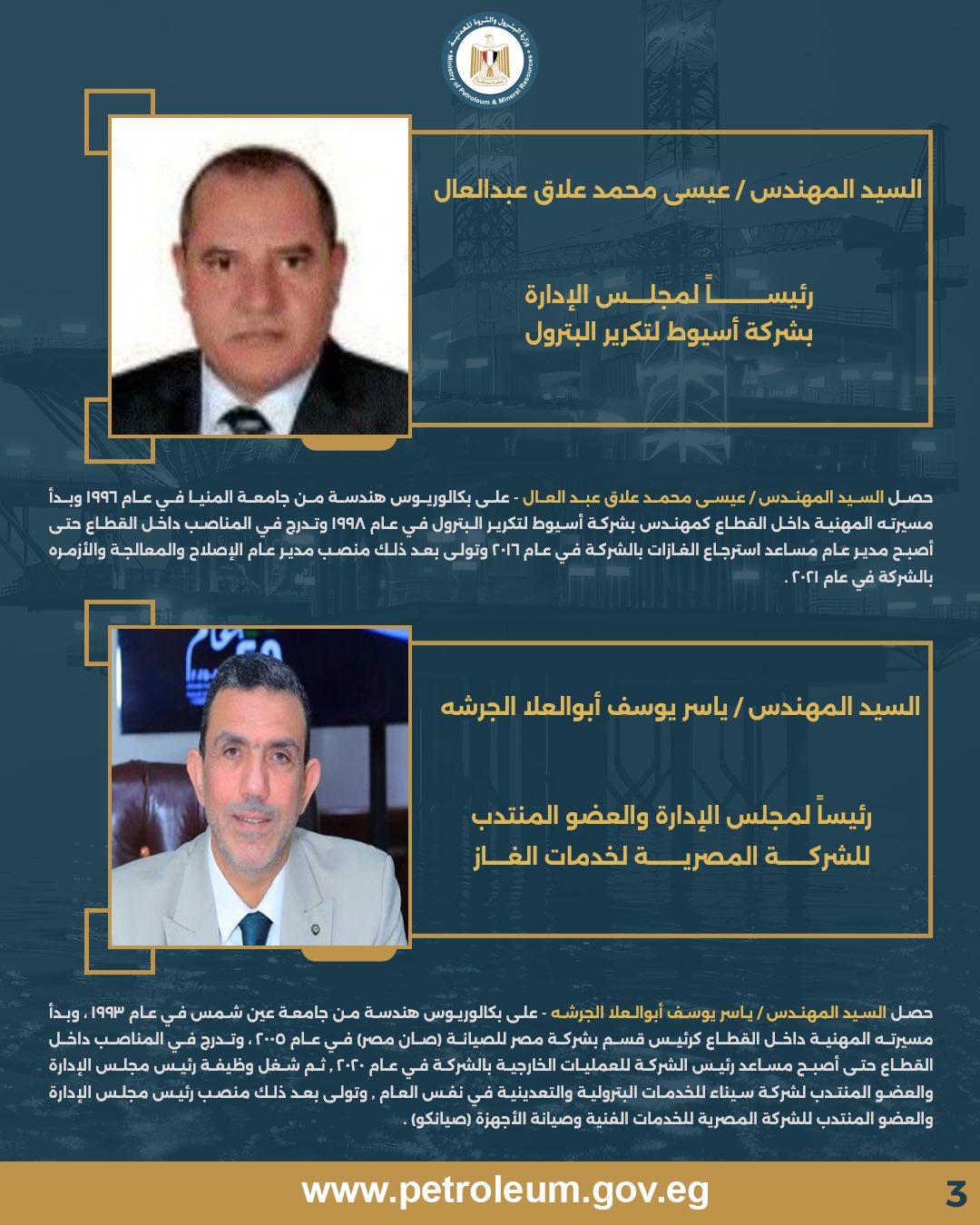 كما أصدر قرارًا بتكليف المهندس سيد أحمد عبد الفتاح سليم عضوًا منتدبًا تنفيذيًا للشركة المصرية القابضة للغازات الطبيعية (إيجاس)، اعتبارًا من 1 فبراير 2026.