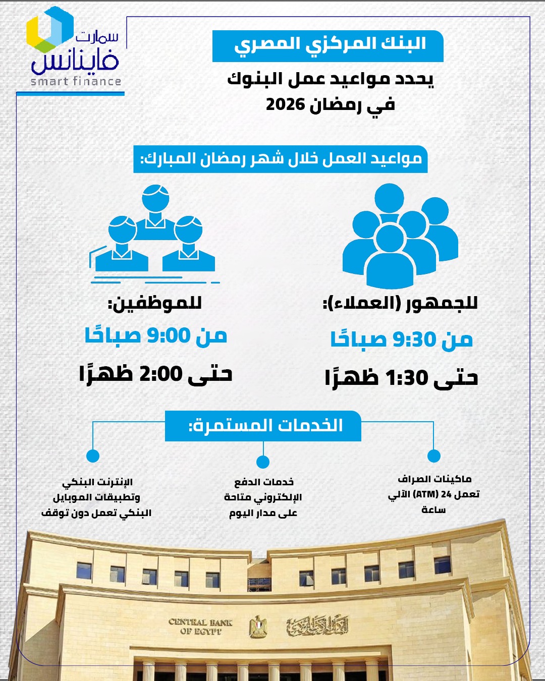 البنك المركزي المصري يحدد مواعيد عمل البنوك في رمضان 2026