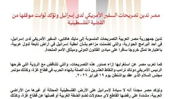 أعلنت وزارة الخارجية والتعاون الدولي والمصريين بالخارج عن إدانة جمهورية مصر العربية للتصريحات المنسوبة إلى مايك هاكابي، السفير الأمريكي لدى إسرائيل، في أحد البرامج الحوارية، والتي تضمنت مزاعم بشأن أحقية إسرائيل في أراضٍ تابعة لدول عربية، باعتبارها تمثل خروجًا سافرا على مبادئ القانون الدولي وميثاق الأمم المتحدة.