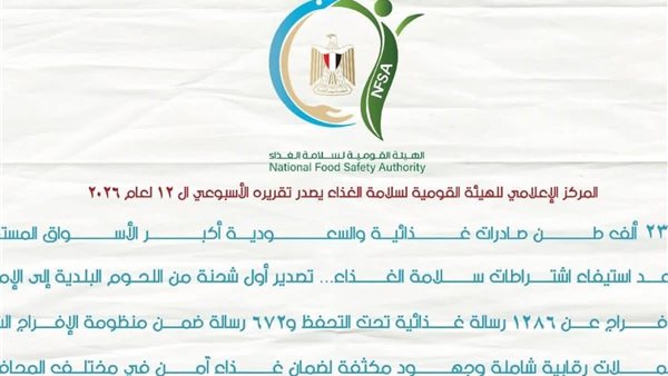 أصدر المركز الإعلامي للهيئة القومية لسلامة الغذاء تقريره الأسبوعي الـ 12 لعام 2026، وذلك عن الفترة من 28 مارس – 3 إبريل 2026، والذي تضمن العديد من الأنشطة المختلفة على النحو التالي:
