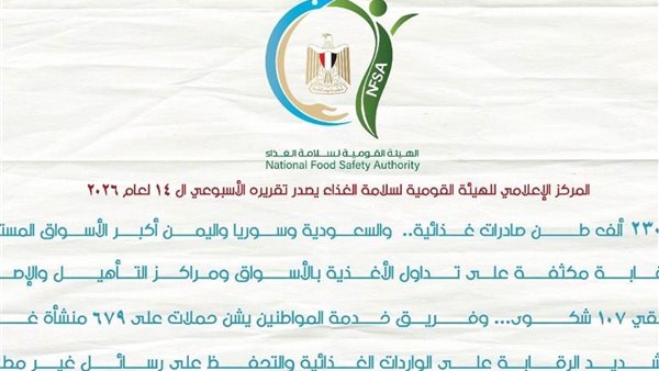 أصدر المركز الإعلامي للهيئة القومية لسلامة الغذاء تقريره الأسبوعي الـ 14 لعام 2026، وذلك عن الفترة من 11 - 17 إبريل 2026، والذي تضمن العديد من الأنشطة المختلفة على النحو التالي: