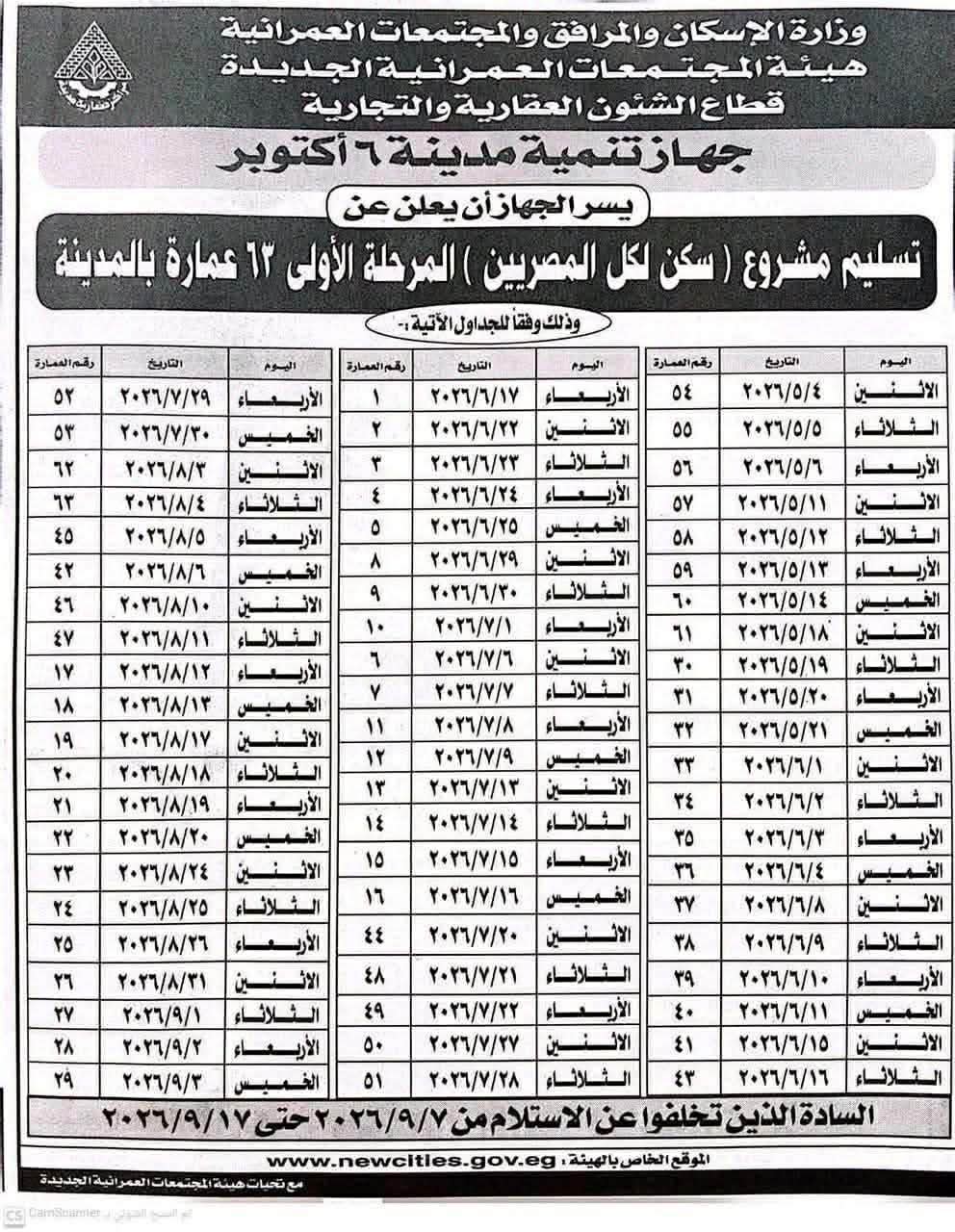 أعلن جهاز مدينة ٦ أكتوبر عن بدء تسليم وحدات المرحلة الأولى من مشروع “سكن لكل المصريين” بإجمالي 63 عمارة بمدينة السادس من أكتوبر، وذلك اعتبارا من يوم الاثنين الموافق 4-5-2026, وفقًا للجدول الزمني المعلن.